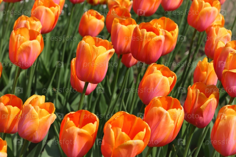 Ближайший снимок клумбы с ярко-красивыми оранжевыми тюльпанами, Юрий Гагарин