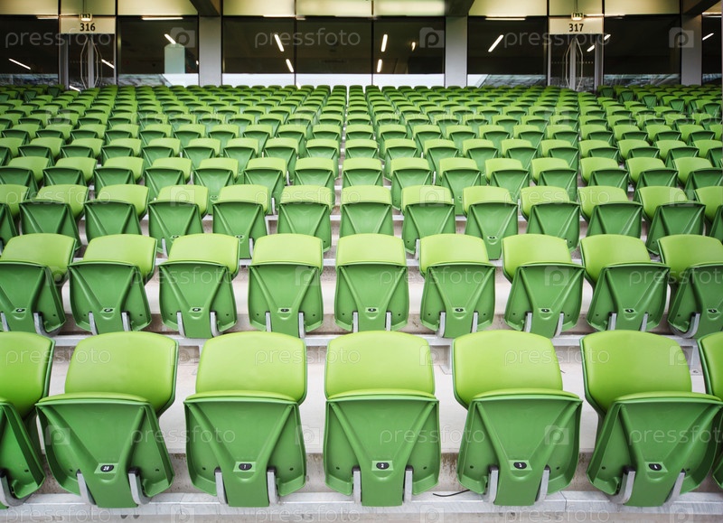 Ряд сложенных, зеленых пластиковых сидений на очень большом пустом стадионе