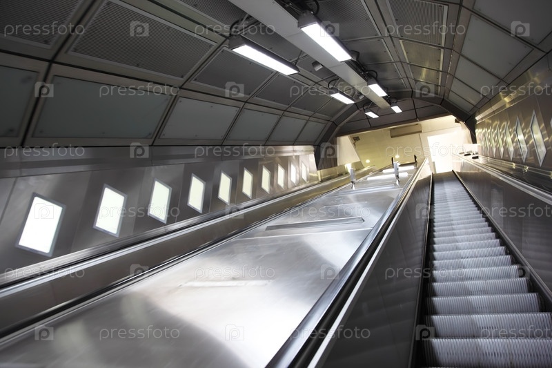 Металлические эскалаторы поднимаются вверх по современному тоннелю метро
