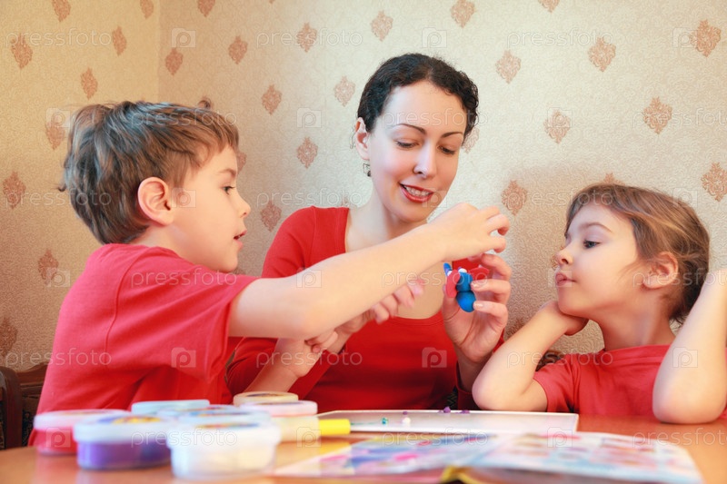 Мать с двумя детьми сидят за столом и лепят модель из пластилина