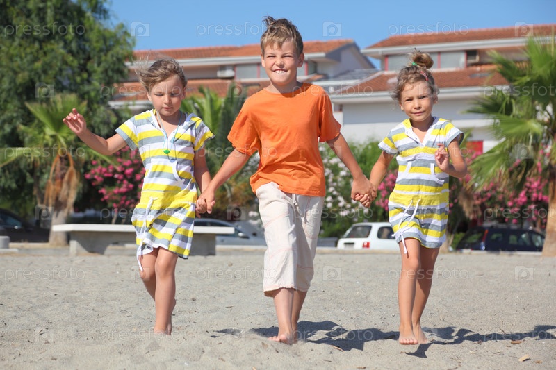 Маленький мальчик и две девочки гуляют по пляжу, держась за руки, ладони