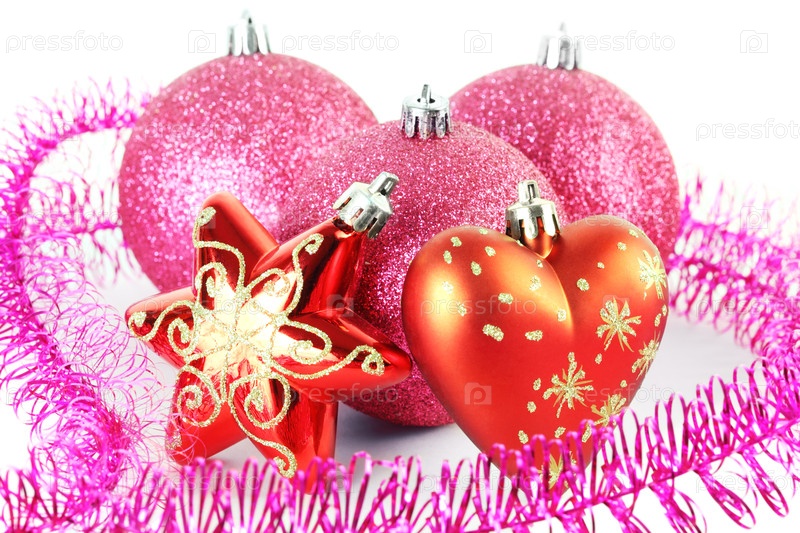 Три красных шарика рождественской елки за звездой и сердцем, окруженные