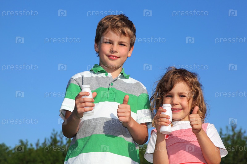 Двое детей с маленькими бутылками йогурта, улыбаются на синем