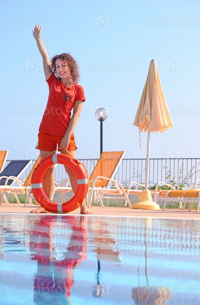 Женщина в красном наряде держит оранжевый защитный платок у бассейна
