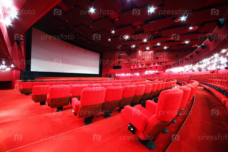 Вид с лестницы на экране и рядов удобных красных стульев в
