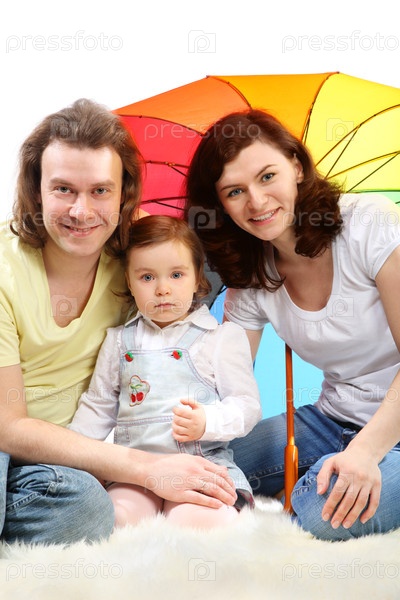 Счастливая молодая семья - мать, отец и маленькая дочь - сидят