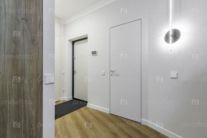 Яркий коридорный интерьер с серой невидимой дверью и светло-серой входной дверью с черной рамкой.Минималистский дизайн со современным круговым стеновым светильником, белыми переключателями и деревянными полами.Профессиональная фотография внутренних помеще
