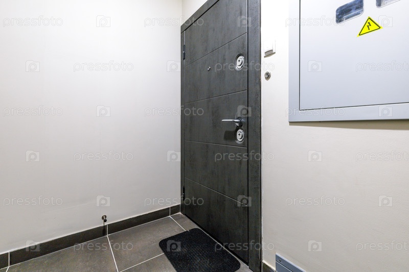 Широкий снимок современного входа к квартире с темно-серой дверью безопасности с каменной текстурой.Минималистский интерьер с серыми напольными плитками, нейтральными стенами и функциональными промышленными деталями, включая металлическую электрическую па