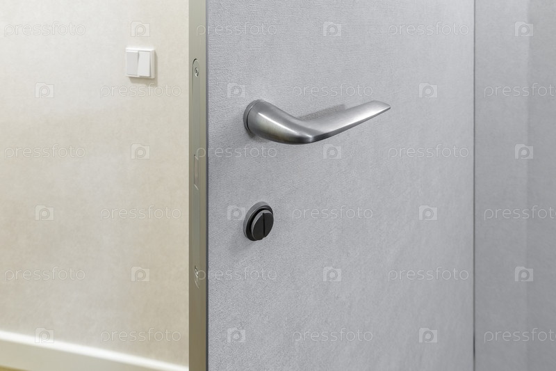Детальный снимок серебряной дверной ручки без розетки на серой текстурированной двери. Близкий план скрытого механизма магнитного замка в минималистическом интерьере. Профессиональные архитектурные детали оборудования с чистым дизайном и премиальной отдел