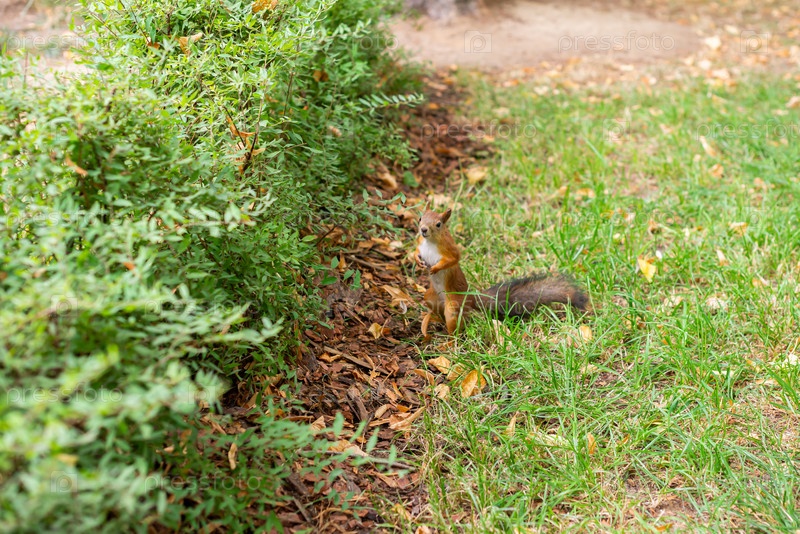 Белка в городском парке. Белка стоит на лужайке