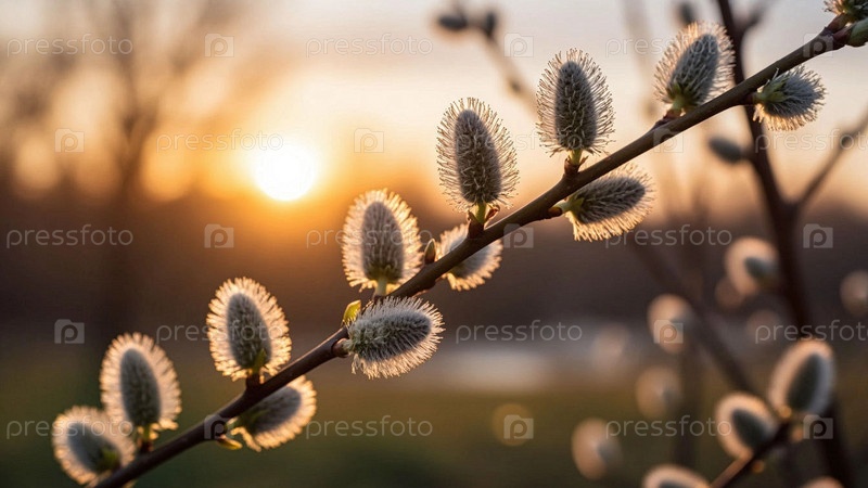 Ветка вербы на закате. Крупный план веток вербы на закате. Верба цветущая крупный план на фоне закатного солнца