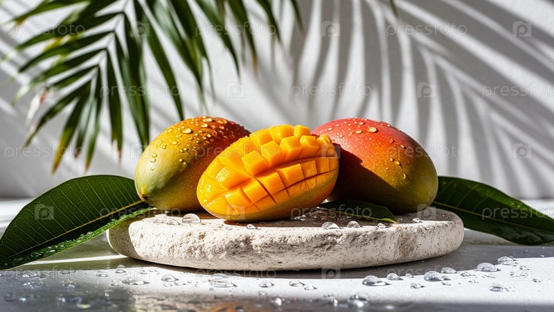 Манго целое и наполовину разрезанное с листьями пальмы и ярким светом. Спелое сочное манго, кусочки манго на камне. Манго крупный план