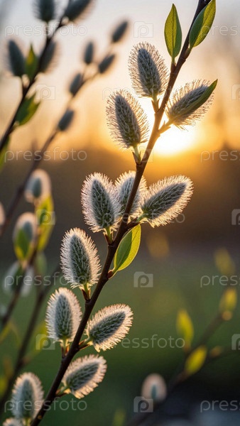 Верба цветущая крупный план на фоне закатного солнца. Вербное воскресенье