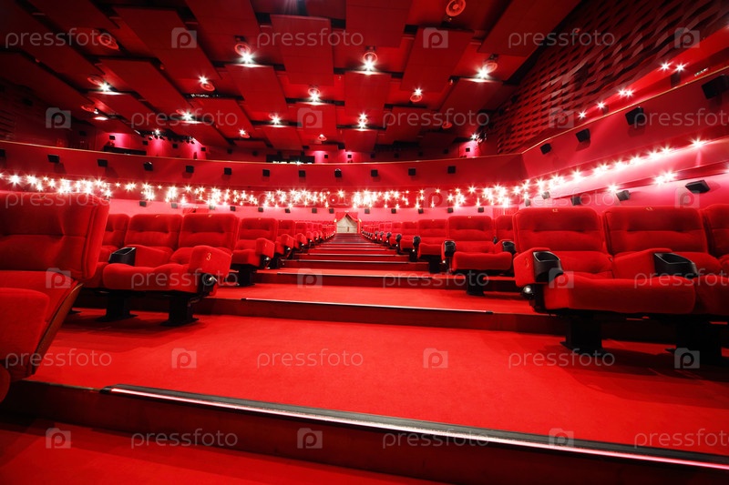 Низкоугольный вид лестницы между рядами удобных красных стульев в