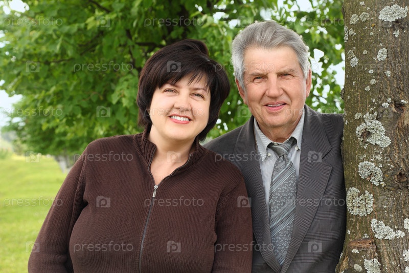 Пожилой мужчина и его взрослая дочь стоят возле дерева и улыбаются