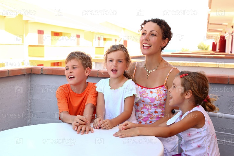 Мать с тремя детьми сидят на веранде летом возле стола и