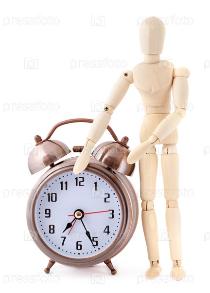 Деревянная фигура стоит рядом с винтажными будильниками