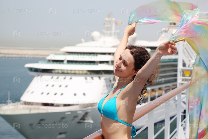 Молодая женщина стоит на палубе круизного лайнера в бикини и держит