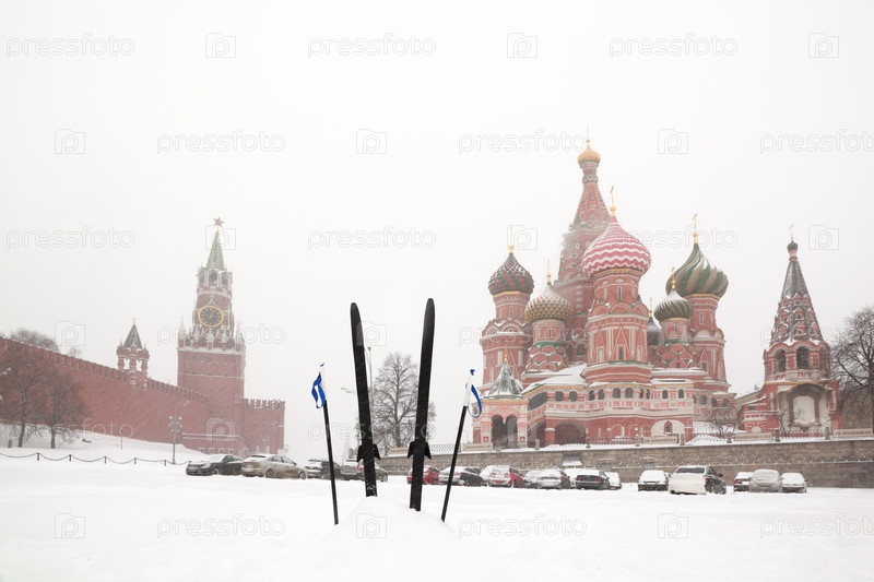 Лыжные лыжи и палки застряли в снегу на Красной площади возле Санкт-Петербурга