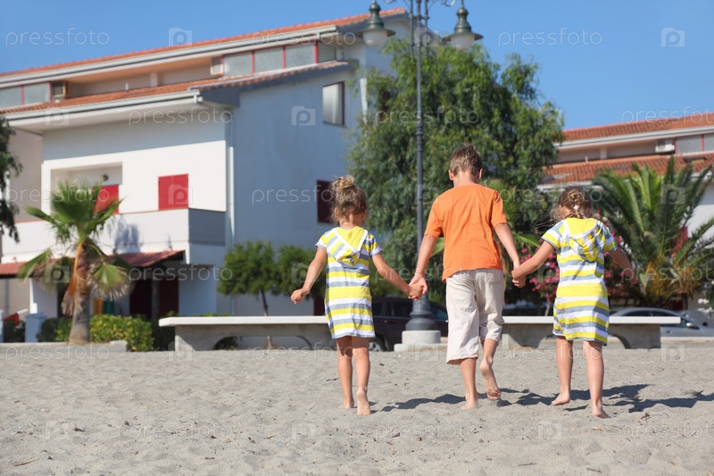 Маленький мальчик и две девочки гуляют по пляжу, держась за руки, вид сзади