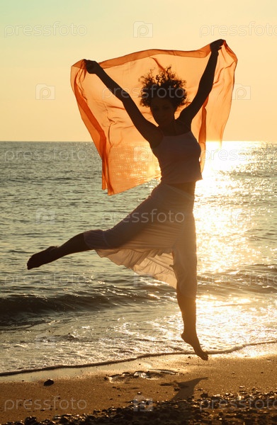 Молодая красивая женщина с красным платкам прыгает на пляже. солнечный свет