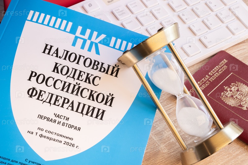 Налоговый кодекс РФ, песочные часы и паспорт на рабочем столе