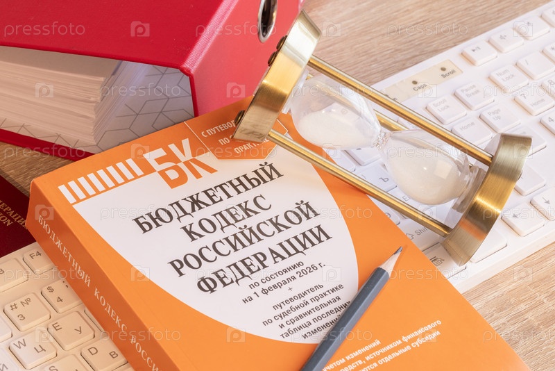 Бюджетный кодекс, песочные часы и папка с документацией на столе кадровика