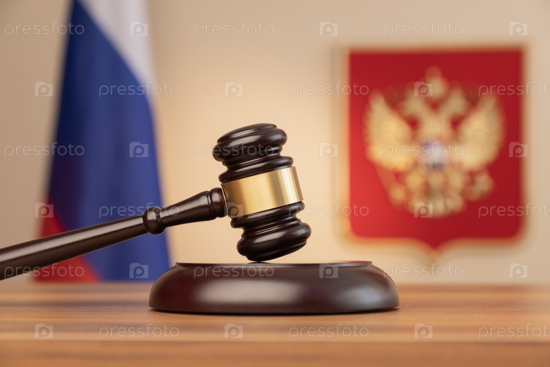 Судебный молоток на фоне флага и герба России