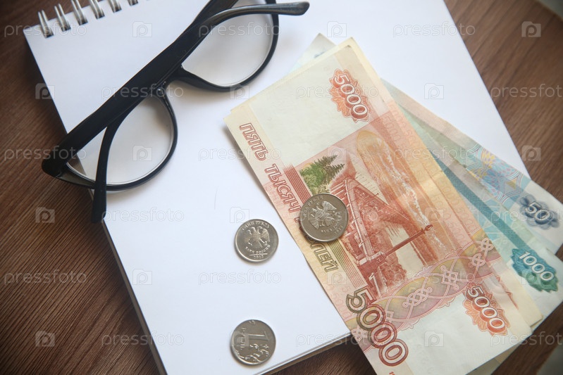 Деньги рубли, очки и блокнот на столе, крупный план, вид сверху