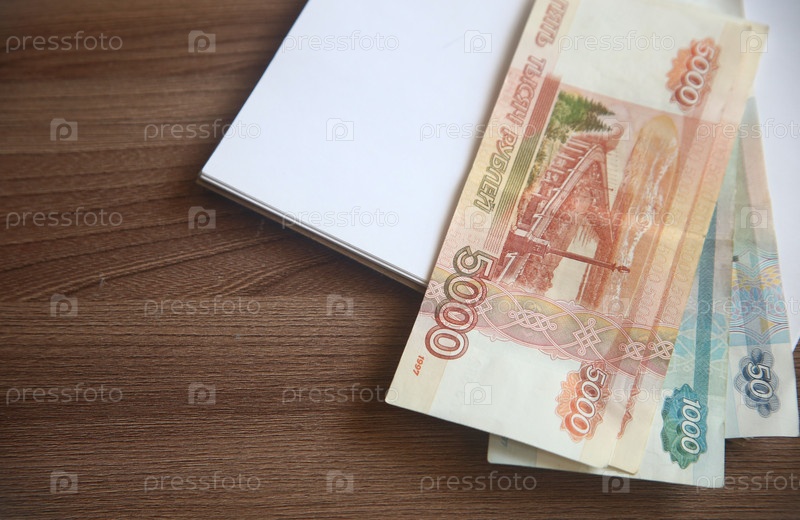 Деньги бумажные рубли, очки и блокнот на деревянном столе, крупный план