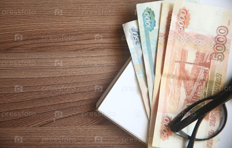 Деньги бумажные рубли, очки и блокнот на деревянном столе, крупный план