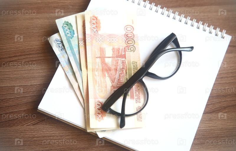 Деньги бумажные рубли, очки и блокнот на деревянном столе, крупный план