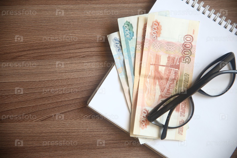 Бумажные деньги рубли, очки и блокнот на столе, крупный план, вид сверху
