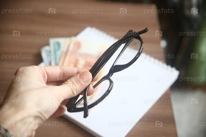 Рука с очками на фоне бумажных рублей, крупный план