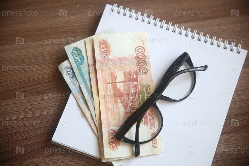 Деньги бумажные рубли, очки и блокнот на деревянном столе, крупный план