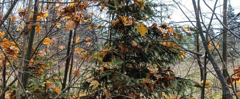 Осень.Елка в кленовых листьях