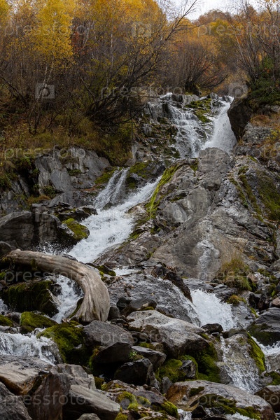 Вид на Чучкурский водопад, протекающий по скалистой лесистой горной склоне