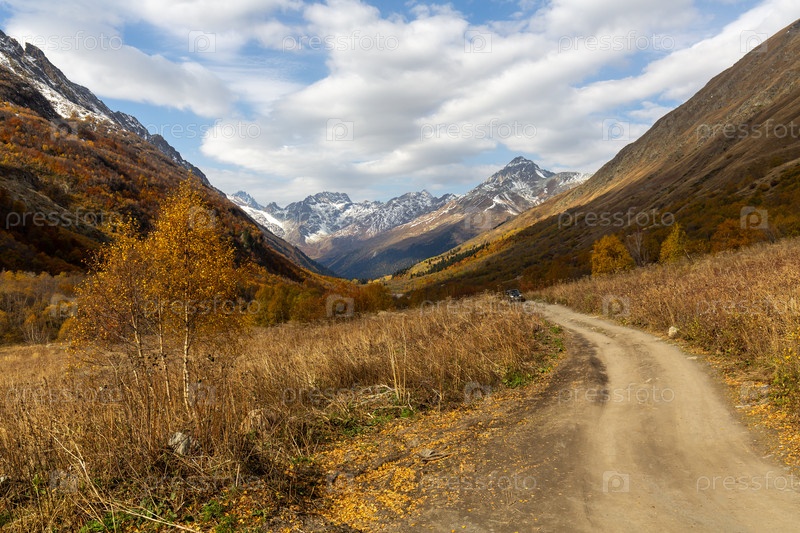 Альпийский пейзаж горного ущелья осенью, Северный Кавказ