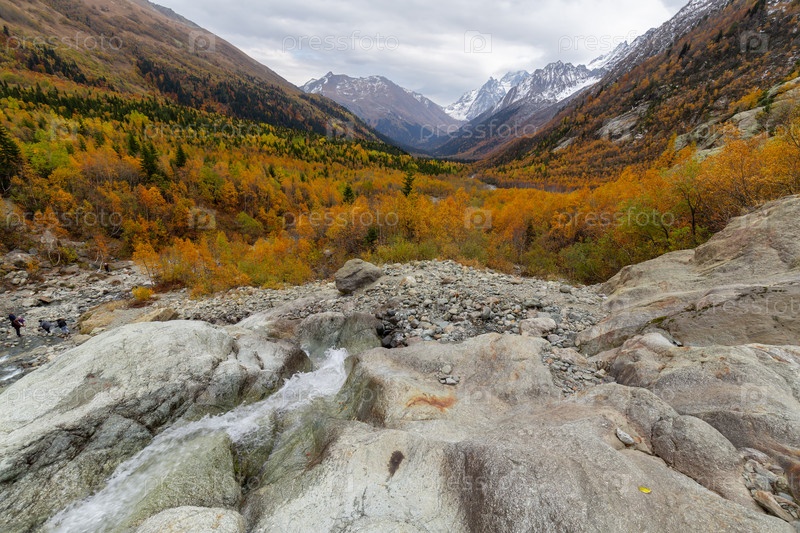 Пейзаж осеннего леса на фоне горного хребта и водопада