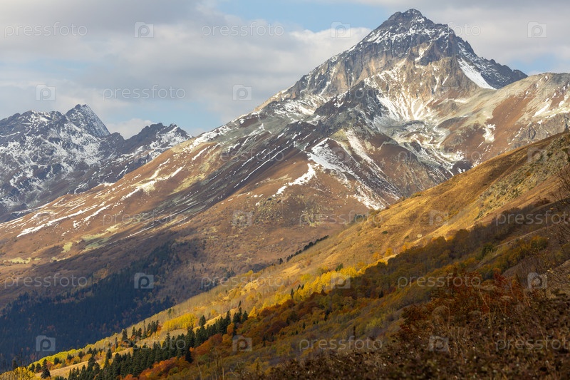 Вид на высокие заснеженные горы и лесистые склоны в ущелье Домбай-Ульген
