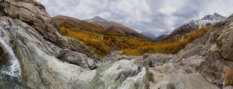 Ландшафт водопада Алибек, протекающего по скалистому склону в Домбае, заповедник Тиберды, Северный Кавказ. пейзаж осеннего леса на фоне горного хребта в пасмурные дни, путешествия и походы на открытом воздухе