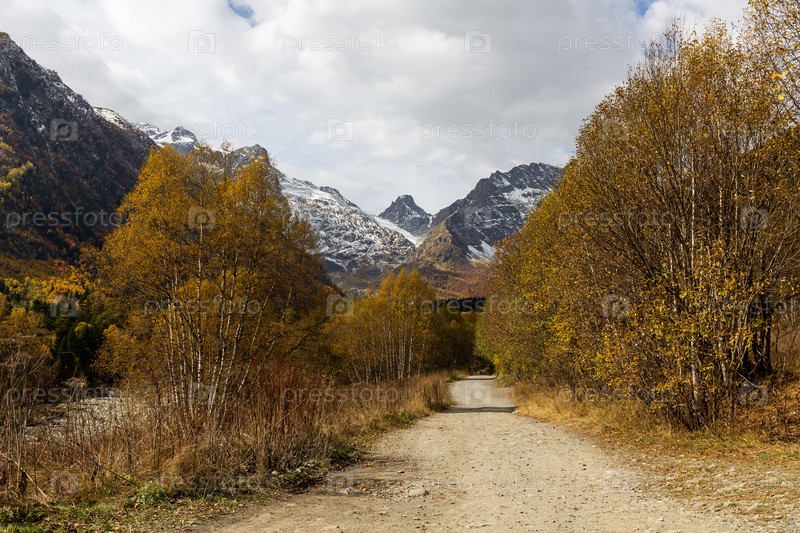 Дорога через осенний лес к высоким горам в ущелье Домбай-Ульген
