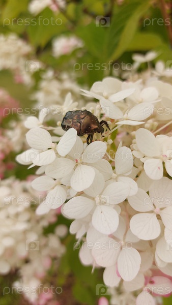 Жук сидит на цветке белой гортензии