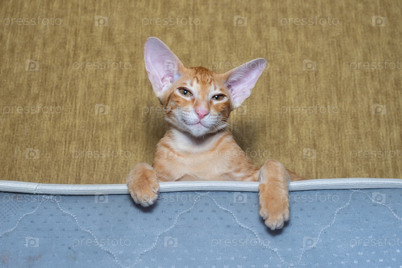 Рыжий котенок с большими ушами и зелеными глазами. Порода ориентал