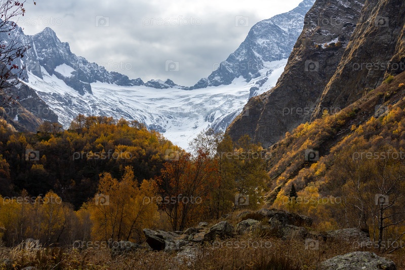 Панорама высоких заснеженных гор, ледников и красочных лесов в ущелье Домбай-Ульген, заповедник Теберды, Северный Кавказ. Красивый осенний ландшафт нагорья. Путешествия и походы