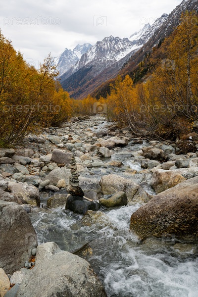 Река Джаловчатка на фоне осеннего леса и заснеженного хребта в ущелье Алибек, заповеднике Теберды, горах Северного Кавказа. Красивый природный высокогорный ландшафт. Путешествия и походы