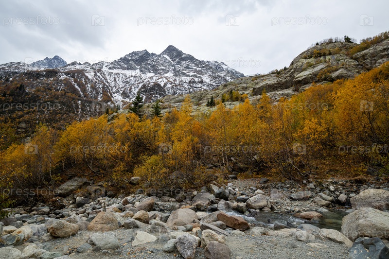 Река Джаловчатка на фоне осеннего леса и заснеженного хребта в ущелье Алибек, заповеднике Теберды, горах Северного Кавказа. Красивый природный высокогорный ландшафт. Путешествия и походы