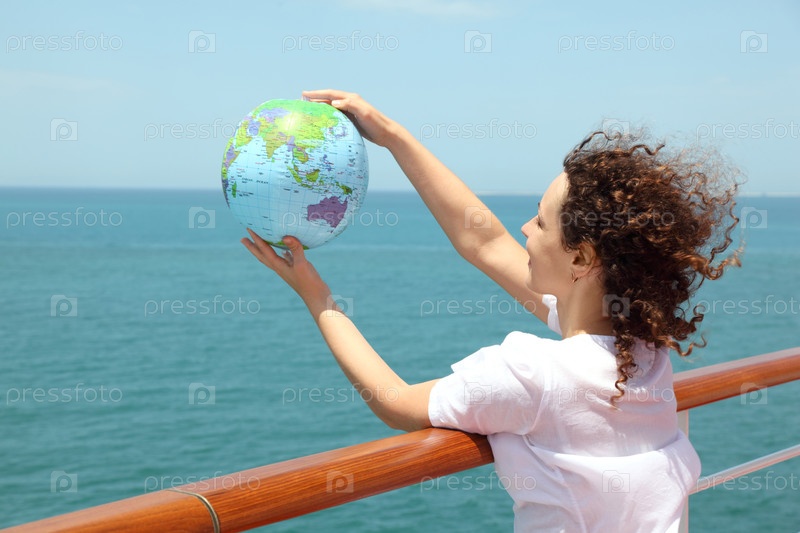 Молодая кудрявая женщина стоит на палубе круизного лайнера и держит инфляцию
