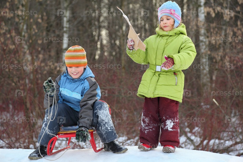 Два ребенка играют в снежном лесу
