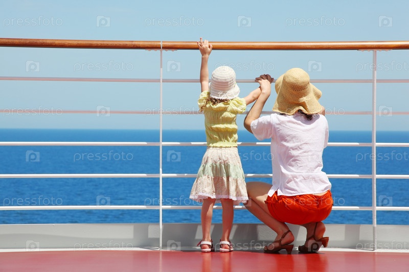 Мать с дочерью стоят на палубе яхты и смотрят назад